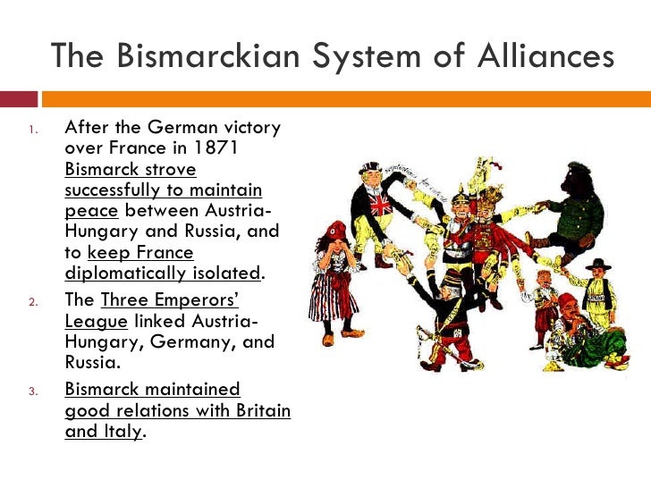 Therein lies an irony that todays moralists find difficult to explain. - The Bismarckian System had the ultimate result of dividing Europe into two opposing groups of nations making war more likely. Alliances could bolster cooperation among all or at least most of the Great Powers as in the case of the Quadruple Alliance which would form the basis of the European Pentarchy and the Concert of Europe. D the creation of a German war college. E the incorporation of Austria-Hungary into the German Empire. The Bismarckian System had the ultimate result of Abringing peace to Europe for over fifty years. It was Bismarcks complex system of overlapping alliances which more than anything kept France isolated and helped preserve the peace of Europe.